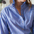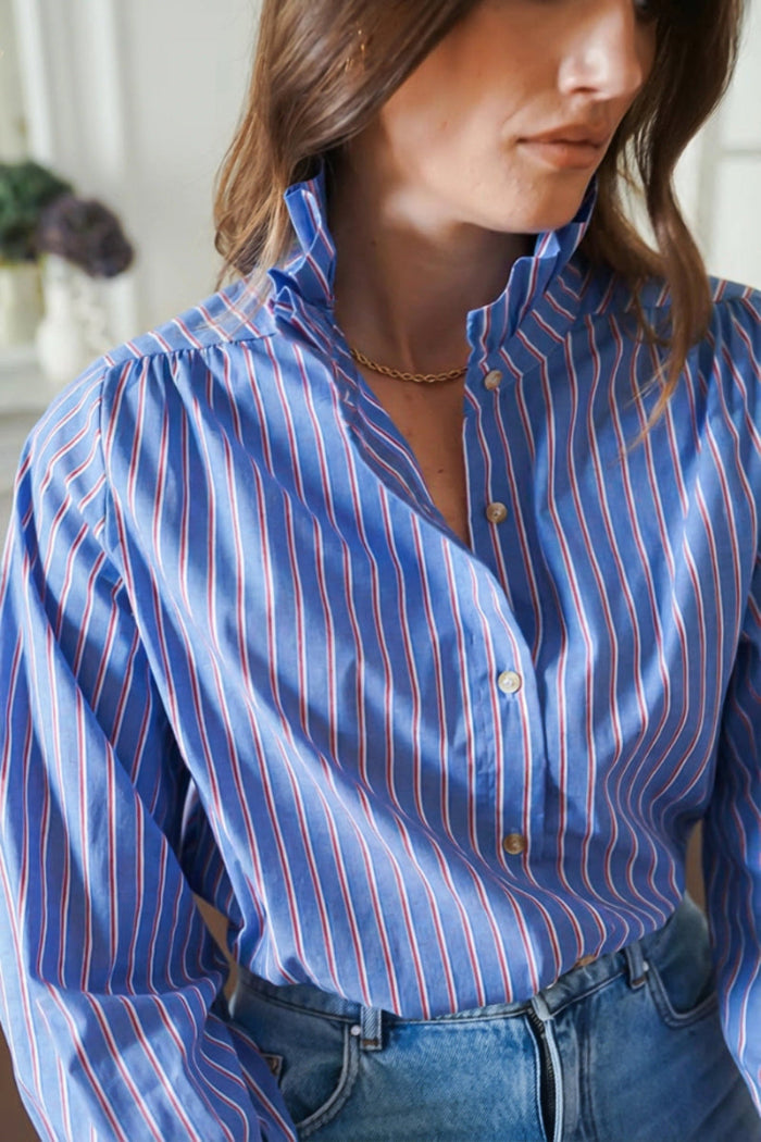 Camisa 100% algodão num fundo azul com riscas encarnadas e brancas. Combine com uns jeans para um look super elegante e clássico. Com um corte no final arredondado.