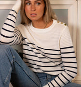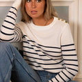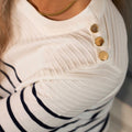 Camisola de meia estação ideal para look mais fresco e leve com destaque para os botões dourados nos ombros.