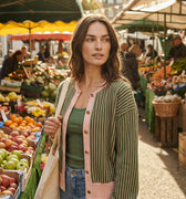 Bomber super elástico e macio às riscas verde e cor de rosa. Fecha com botões dourados de metal.