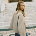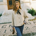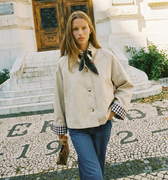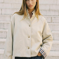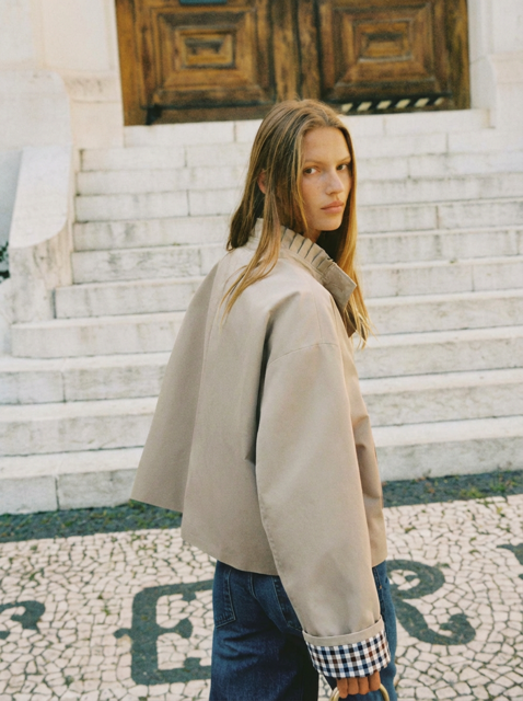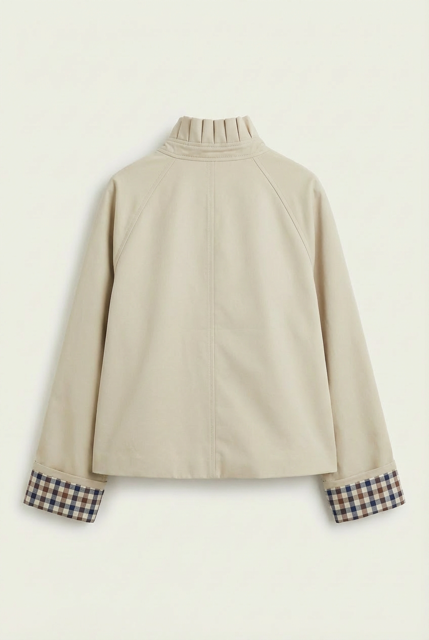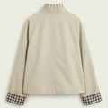 Gabardine curta com folho na gola para um look ultra feminino e romântico. O forro das mangas é num padrão em xadrez.