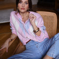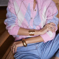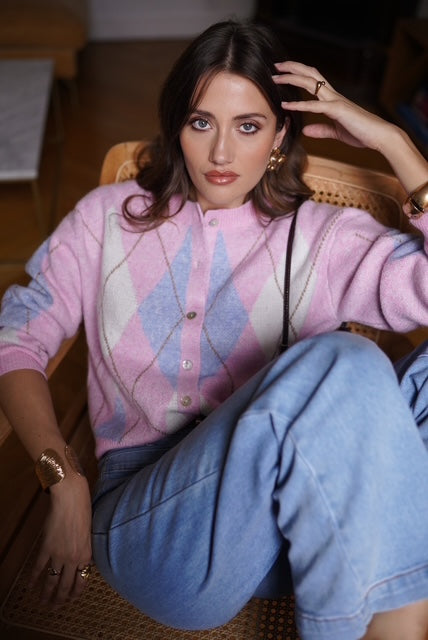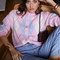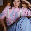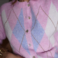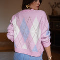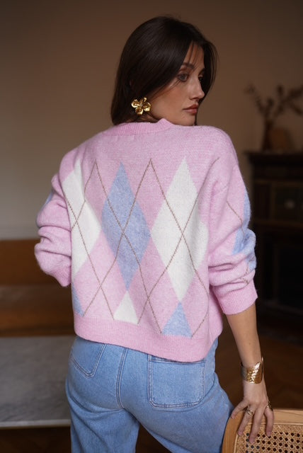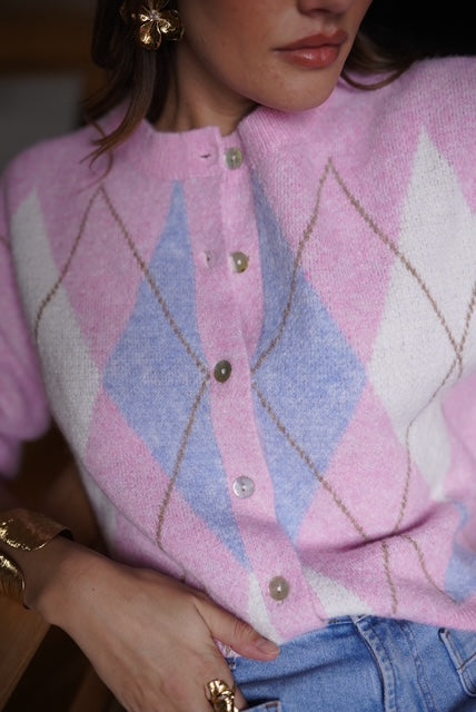 Casaco de lã com gola redonda e padrão de xadrez em tons rosa e azul. É uma peça quentinha e muito confortável.