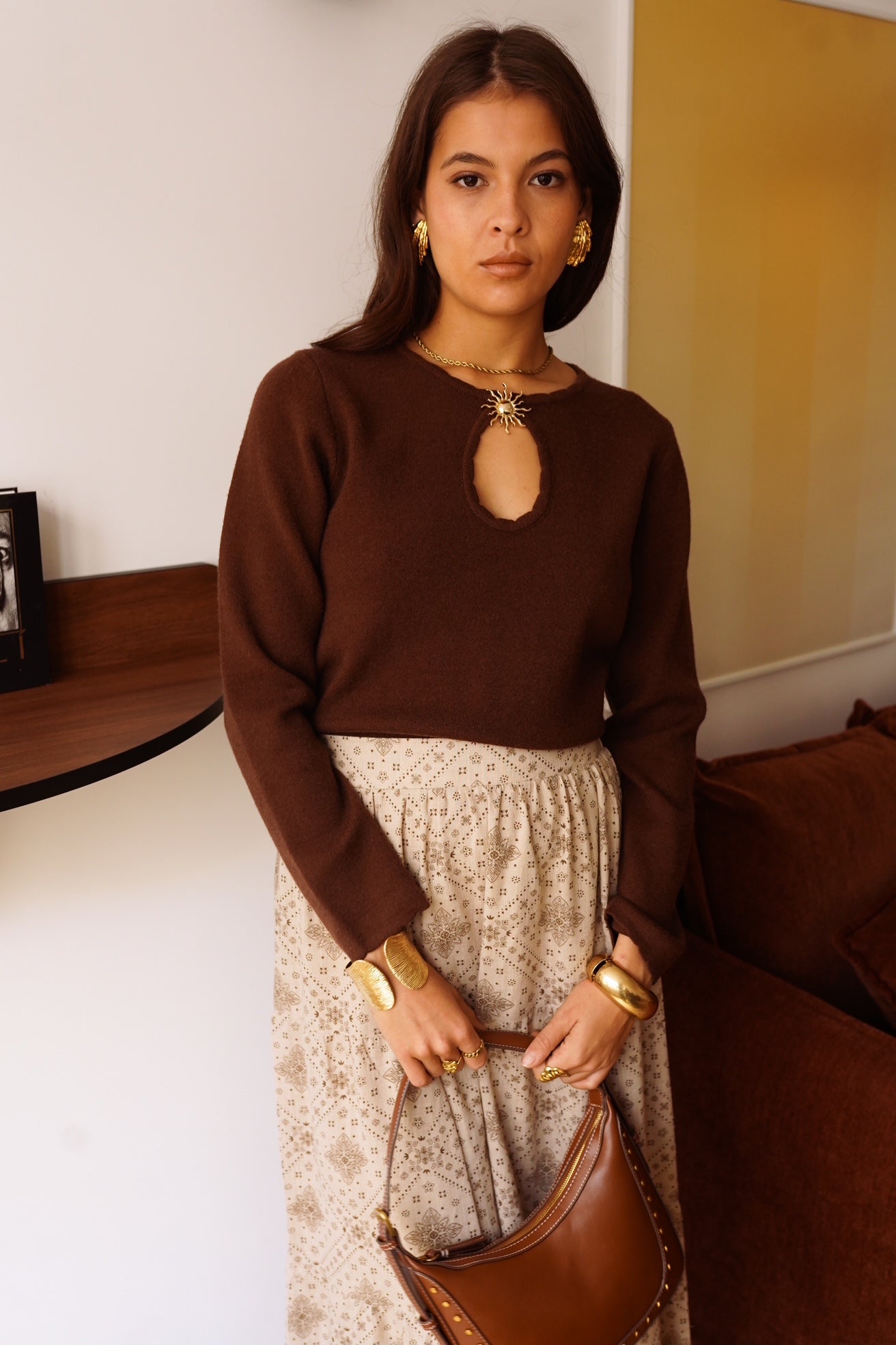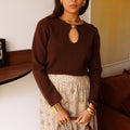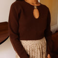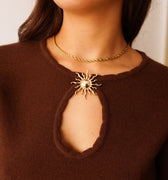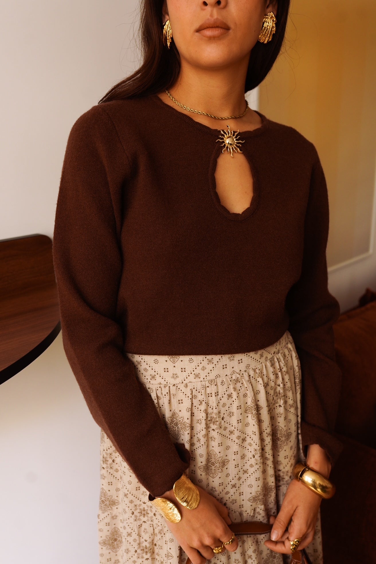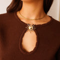 Camisola em malha macia com um pormenor no decote: uma pregadeira em forma de sol que está cosida na malha e tem uma abertura.