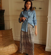 Saia comprida com uma abertura lateral e elástico no cós.