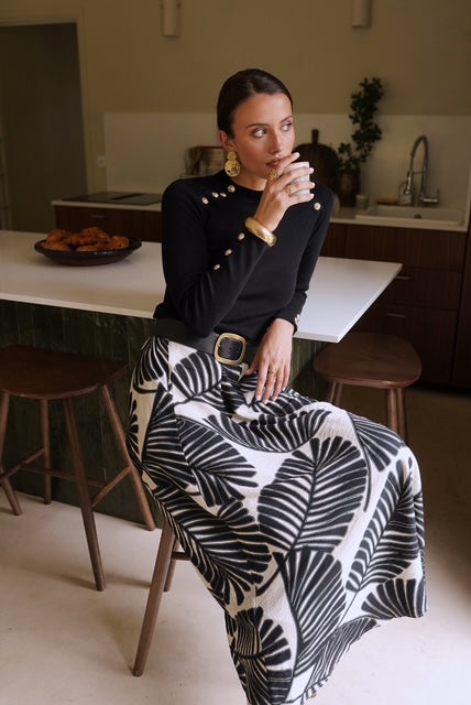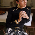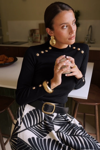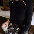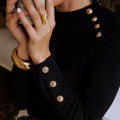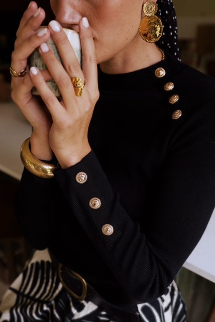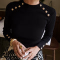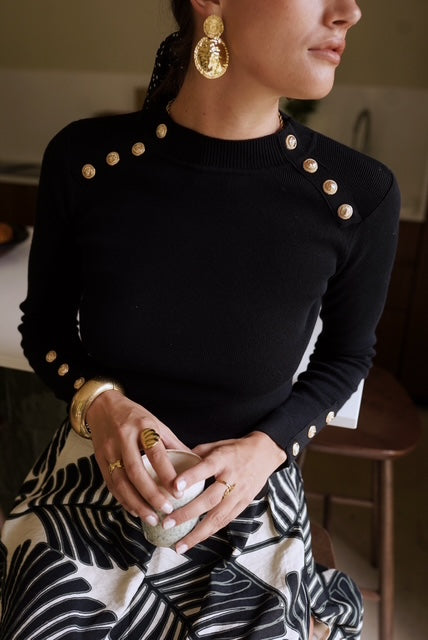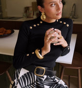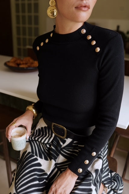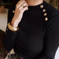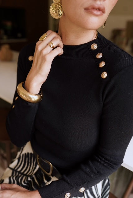 Camisola essencial em malha macia com elastano que dá muito conforto e "estica". Tem botões dourados nos ombos e nos pulsos.