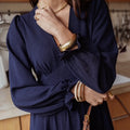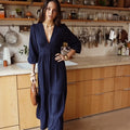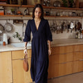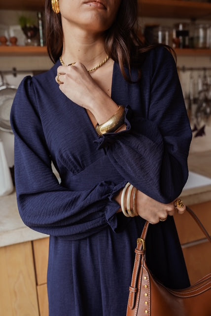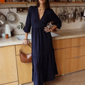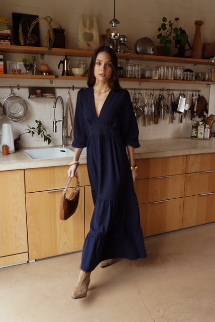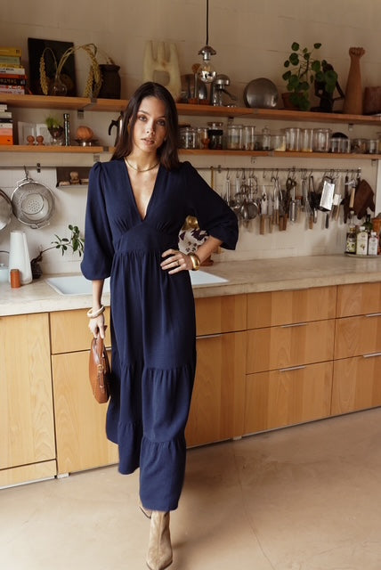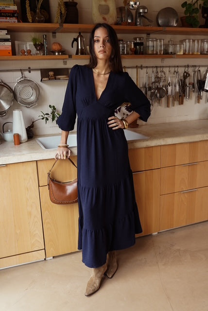 Vestido leve e fluído comprido azul escuro com decote em V, elástico atrás para definir e tornar a cintura mais elegante. Tem mangas com folho. Use com umas botas ou mesmo uns ténis para um look mais informal.