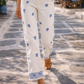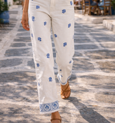 Calças de corte direito com cintura subida, com flores bordadas nas pernas e na parte de baixo para um look original e alegre.