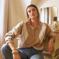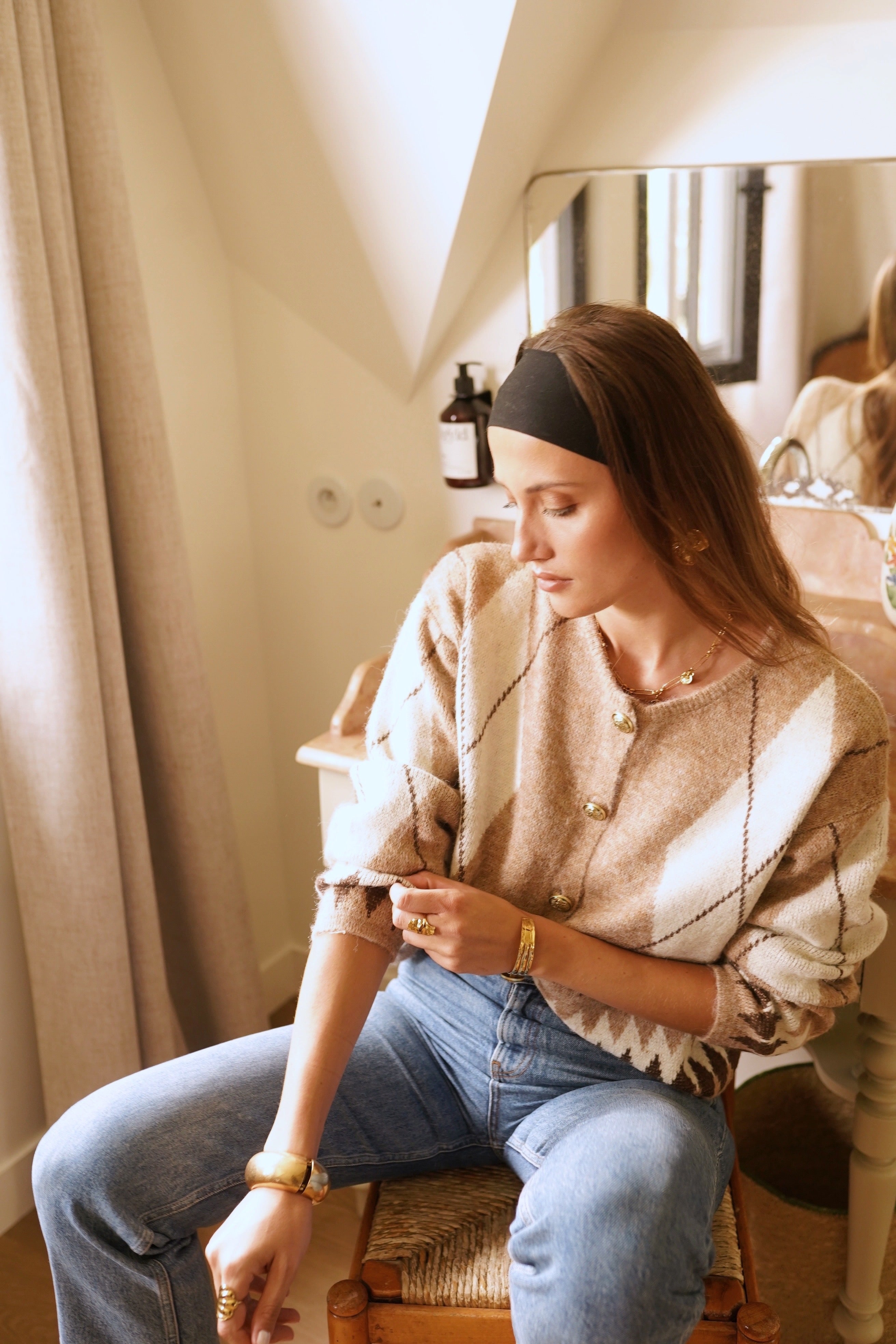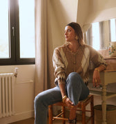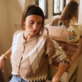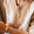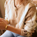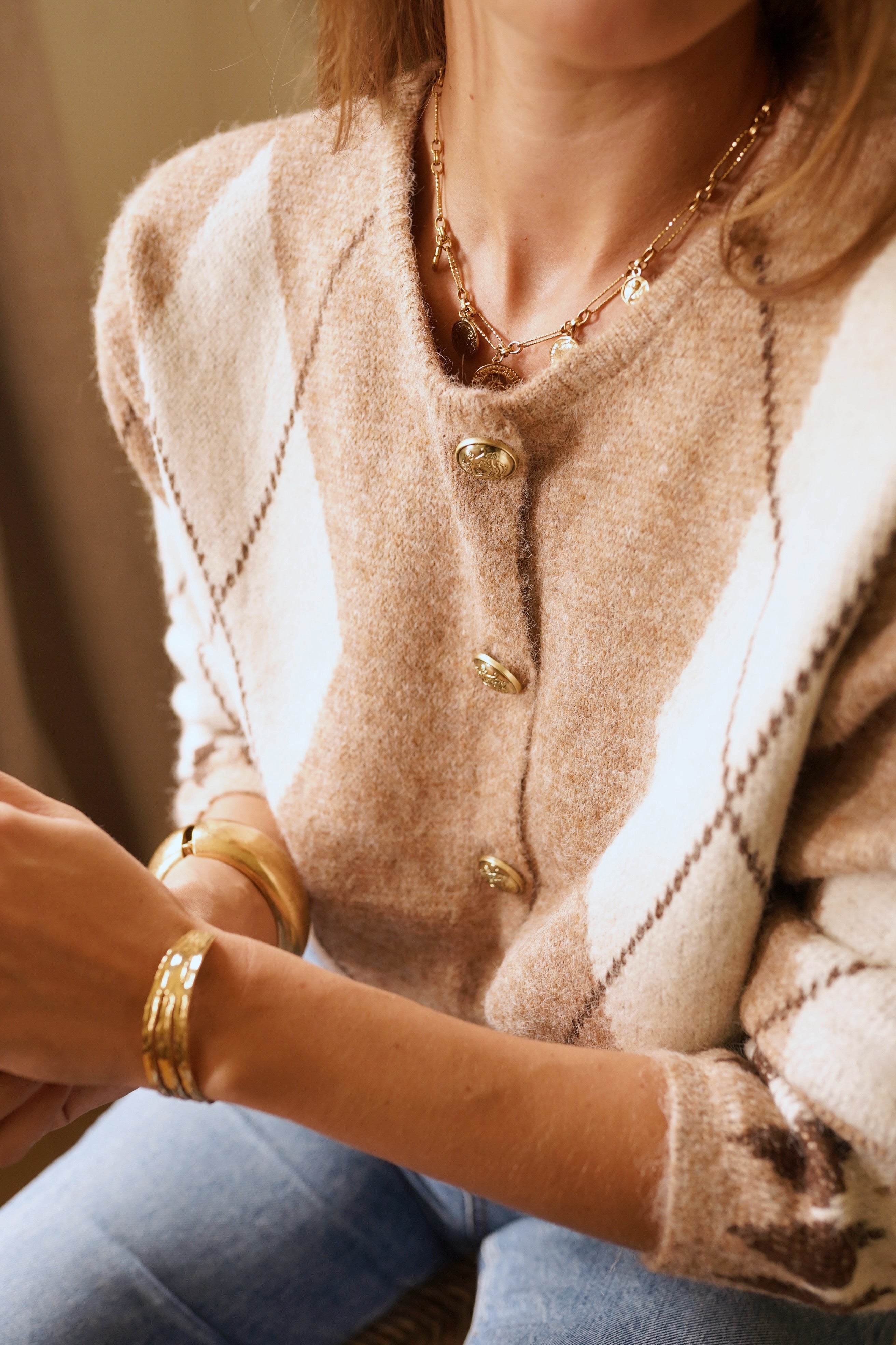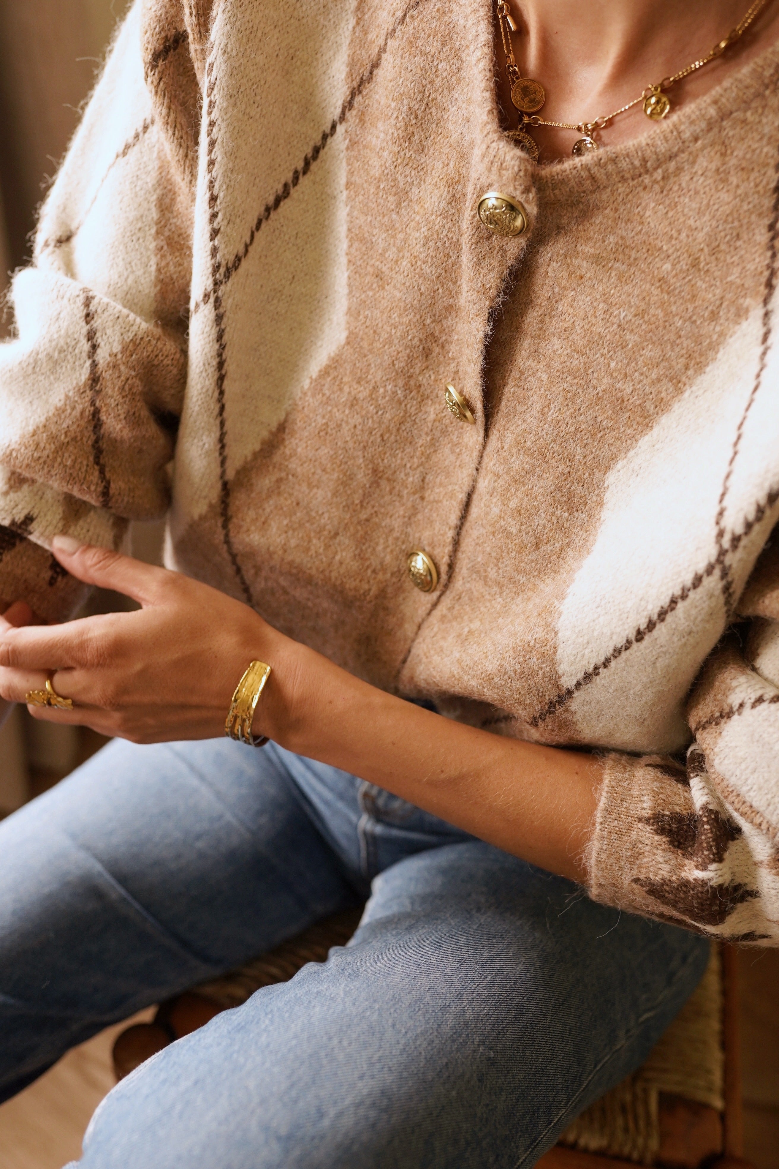 Casaco de lã macia com botões em tons de xadrez bege claro.