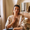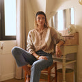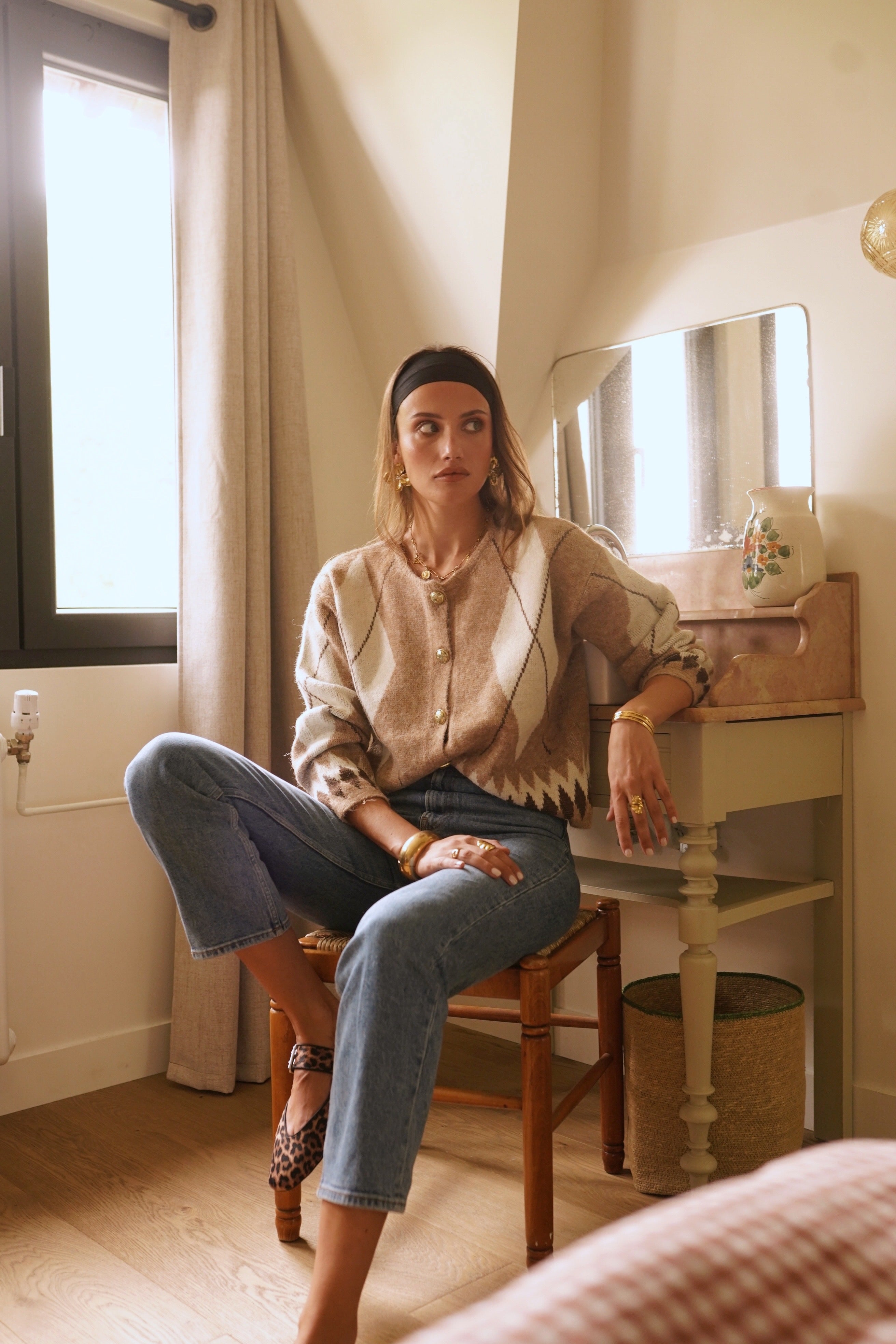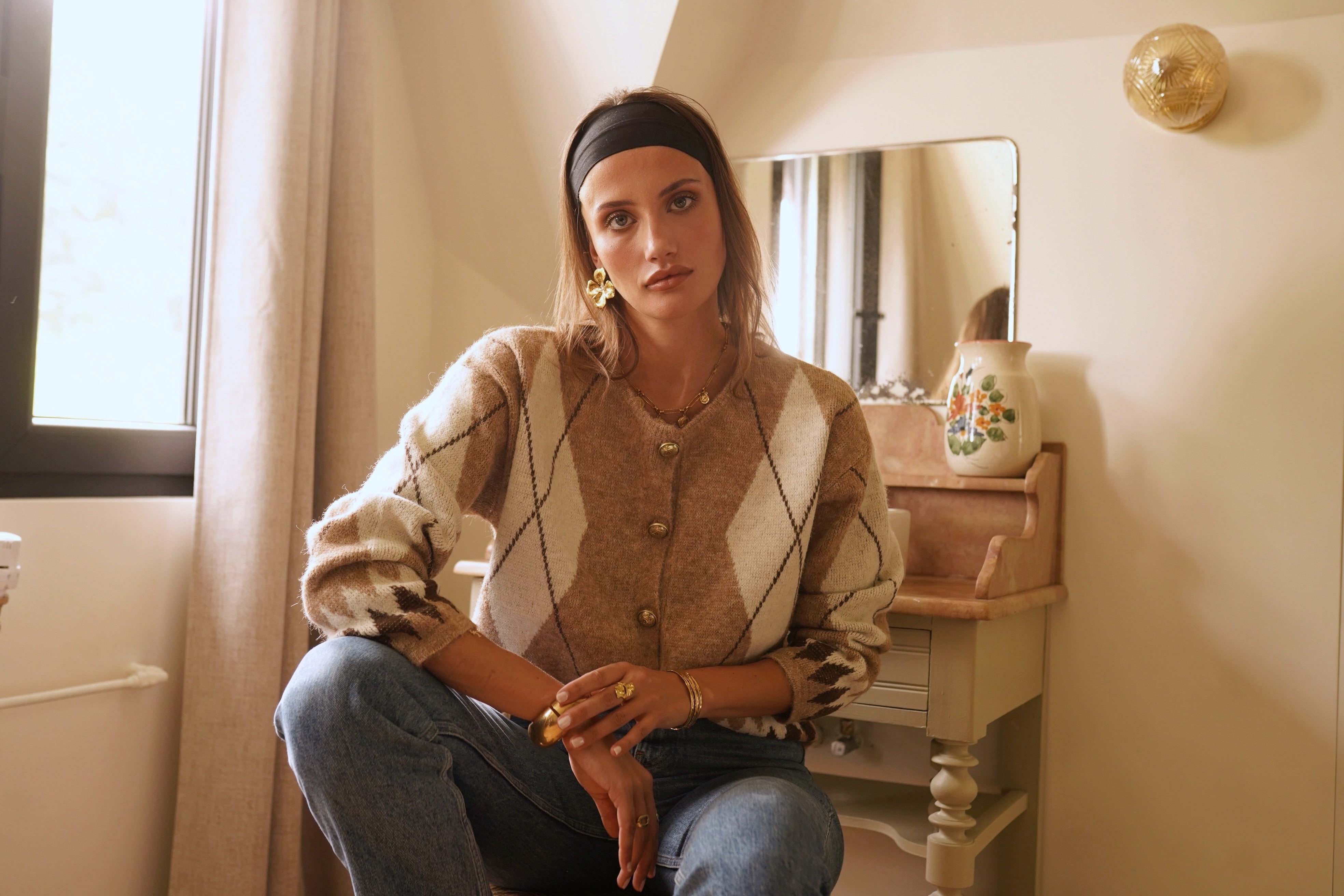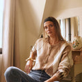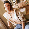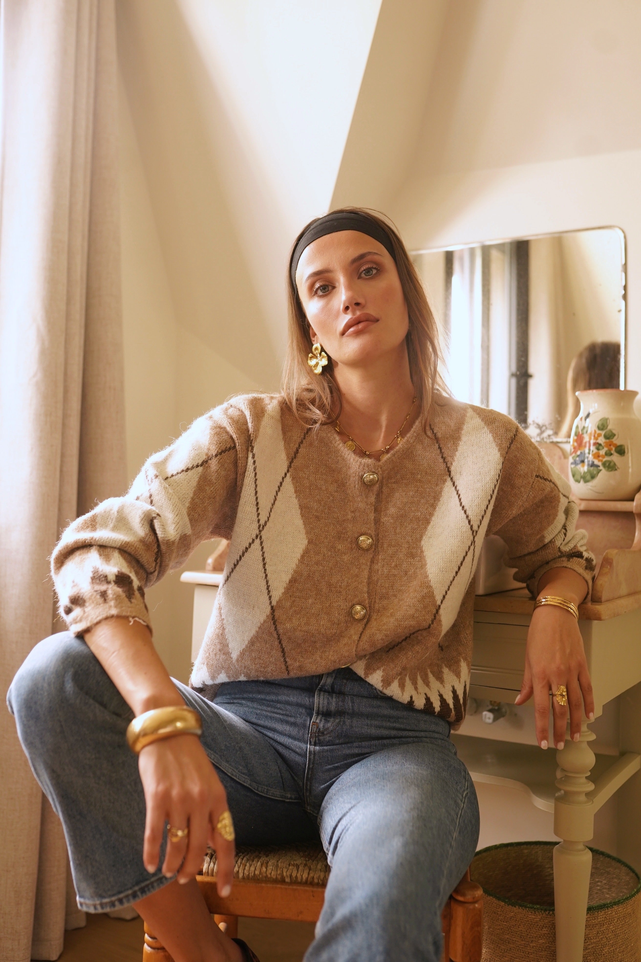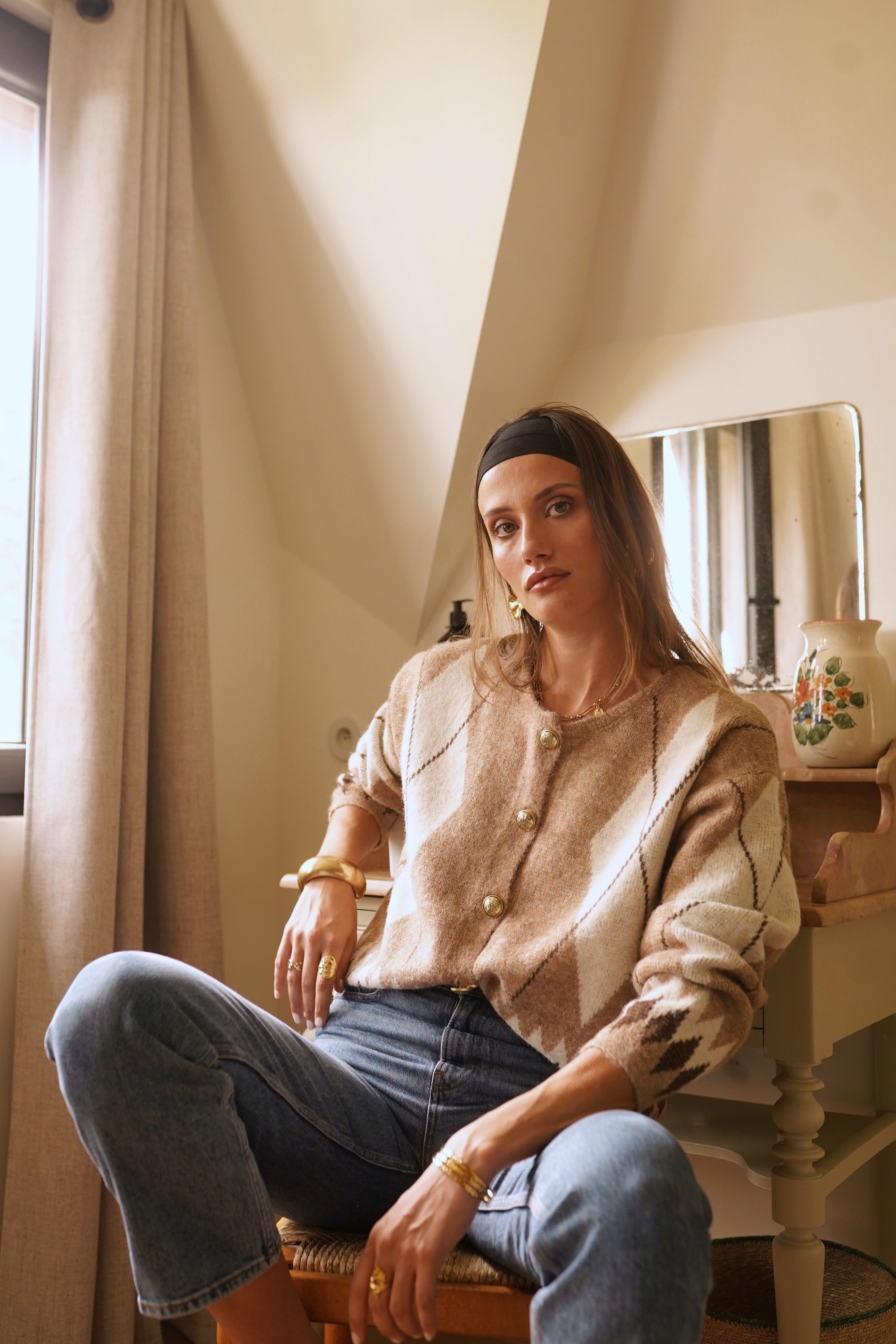 Casaco de lã macia com botões em tons de xadrez bege claro.